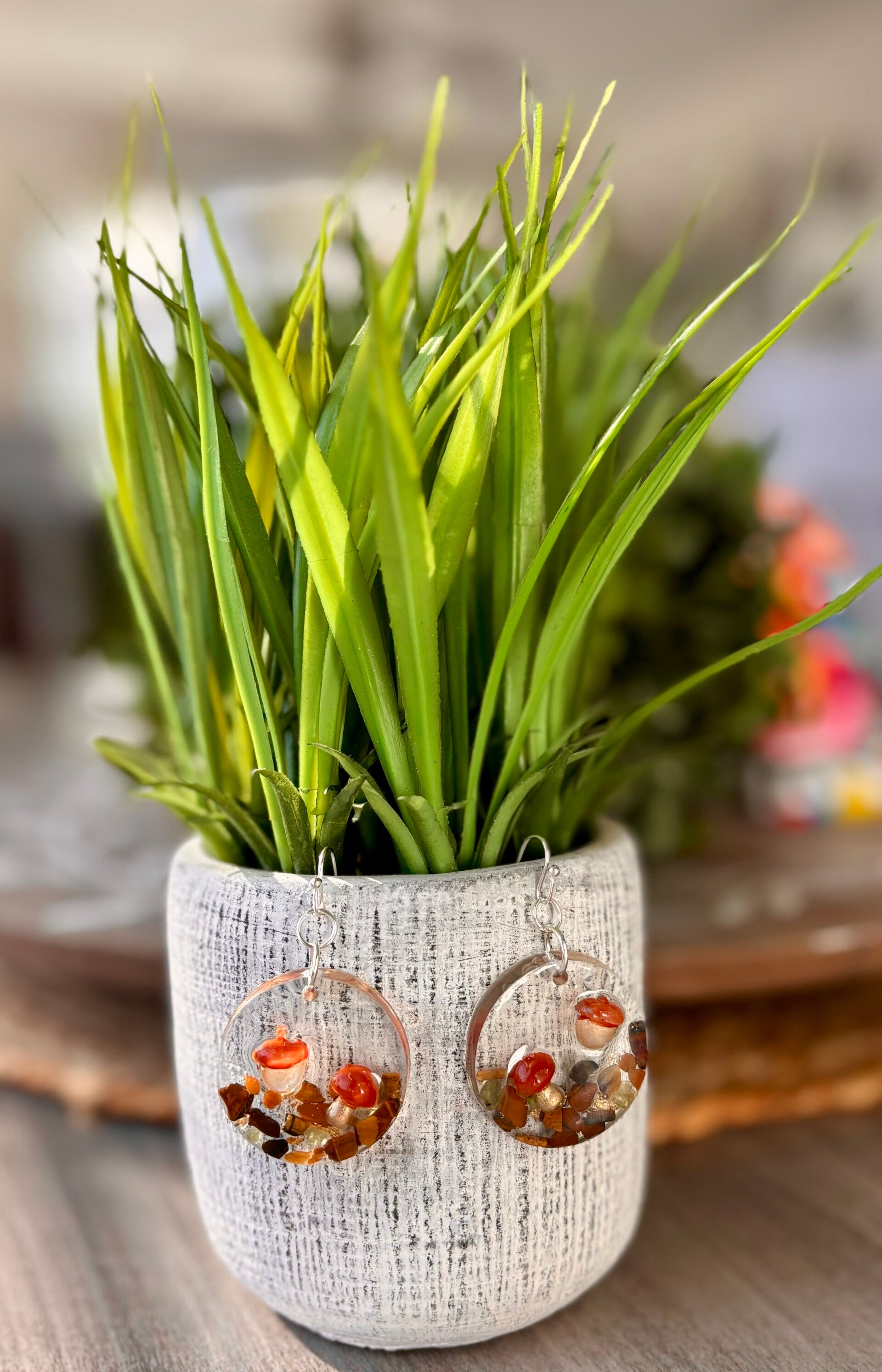 Hand painted resin mushroom scene made with natural stones silver dangles